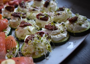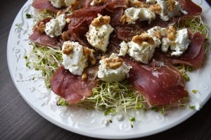 Dette er et typisk bilde på noe jeg kan kaste sammen, det ser imponerende ut men er egentlig såre enkelt… Du tar det du har av skinker, pølser, oster, bær og nøtter og setter sammen et lekkert fat, vanskeligere er det ikke.