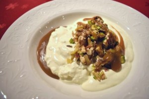 Avkjøl, før du danderer litt karamellsaus i bunn på en tallerken, riskrem, så hakket nøtteknekk og enda litt mer saus på toppen. Denne sausen kan du bruke til veldig mye forskjellig, på brownies, iskrem osv. Den smaker kjempegodt!