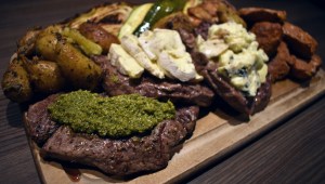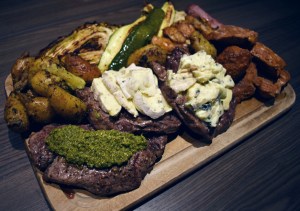 Ellers er det tre typer biff, en med pesto, og to med ulike typer ost, kylling, squash, spisskål og løk.
