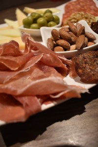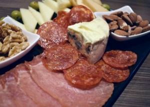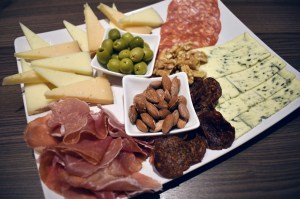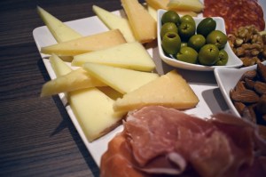 Forskjellige oster, gjerne spanske, oliven, spekeskinke, nøtter etc.