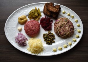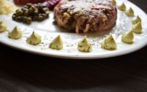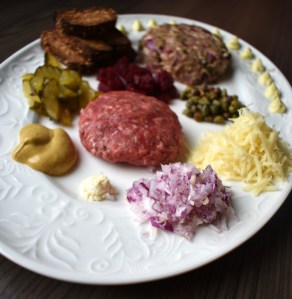 Her har jeg lagd to ulike tartarer, en plain (kun karbonadedeig) og en blandet (alle ingrediensene på tallerkenen iblandet karbonadedeigen).